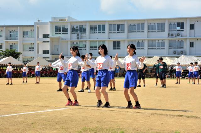 平良中学校(宮國幸夫校長)は30日、同校グラウンドで運動会を実施した。「全勝全笑~青春は僕らのものだ~」をスローガンに青空の下、511人の生徒が特技やダンスなど練習の成果を披露した。各学年の学級対抗リレーでは力を合わせて健脚を競った。