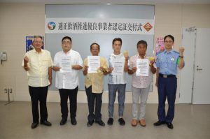 ちゅらさん運動の一環で実施している適正飲酒推進優良事業者制度の認定証交付式が30日、市役所であり、宮古かぎすま安全なまちづくり推進協議会長の座喜味一幸市長がバス会社4社に認定証を交付した。認定されたのは共和バス、八千代バス・タクシー、中央交通宮古島営業所、宮古協栄バス。