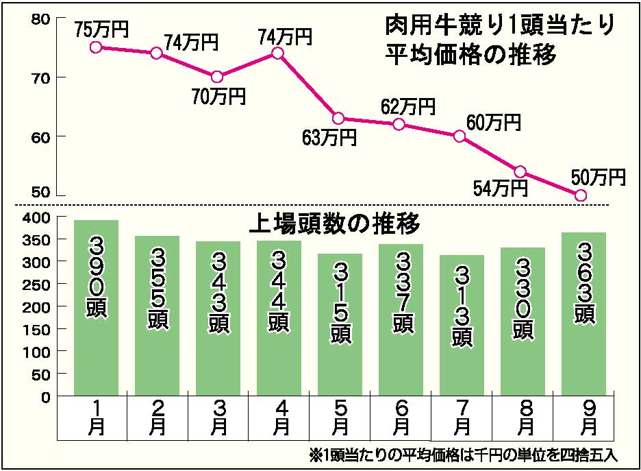 子牛価格は今年1月から4月までは70万円台の高値を維持。しかし、5月競りで60万円台に値を下げた。6、7月でも回復せず、8月には50万円台になった。9月は前月比4万円安と下げ幅は縮小したものの40万円台目前の50万3291円となった。