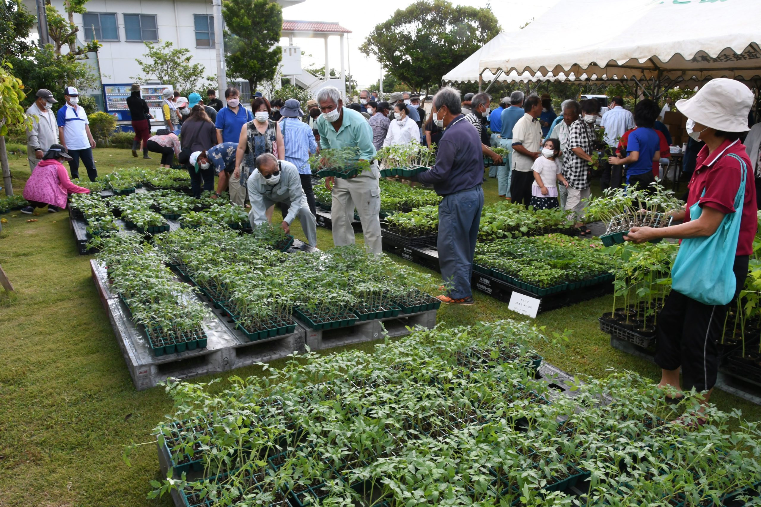市みどり推進課による花苗、野菜苗、花木苗、果樹苗木の販売会が2日、平良東仲宗根にある同課事務所東側広場で開かれた。販売開始時間の午前9時より前から市民による長い列ができる人気ぶりで、会場はお目当ての苗を買い求める大勢の来場者でにぎわった。