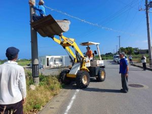 きょう5日から2日間、島尻で開催される伝統祭祀(さいし)の仮面来訪神「パーントゥ」が3年ぶりに行われるのに先立ち、4日、邪気や病気を追い払う伝統行事「スマッサリ」(主催・島尻自治会)が行われた。豚の骨を結んだ縄は、集落の入口8カ所の木や電柱を利用して道路上に張り渡された。住民は、無病息災、子孫繁栄を願った。この縄は5日正午以後に下ろされ、パーントゥがまとうツル草を縛り付ける縄として用いられる。