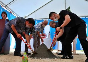 2024年4月に統廃合で廃校となった城辺中学校舎を活用して観光学部の設置計画を進めている宝塚医療大学(兵庫県宝塚市、岸野雅方学長)の宮古島キャンパス学生寮新築工事の地鎮祭と直会が6日に同校舎で行われた。出席した大学関係者や工事関係者がくわ入れなどの神事を行い、工事の安全を祈願した。24年2月の完成を目指している。