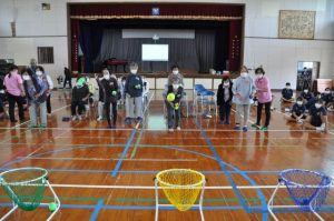 城東中学校(比嘉豊樹校長)は6日、同校にお年寄りたちを招き、「わくわくふれあい運動会」を開催した。「運動会の歌」を合唱したり、玉入れで競ったりして交流を深めた。