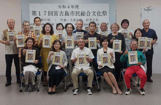 第17回宮古島市民総合文化祭(児童生徒の部、一般の部)が3年ぶりに開催される。主催する市、市教育委員会、市文化協会が11日、市役所で合同会見し、日程や内容などを発表した。テーマは「創造する市民の文化」。座喜味一幸市長は「これまでの空白部分を埋める熱い作品が発表できるものと期待している」と話した。文化祭は21日の一般の部の展示(市未来創造センター)で開幕し12月まで開かれる。