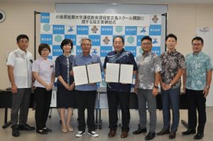 学校法人三幸学園(東京都文京区)が運営する小田原短期大学(神奈川県小田原市)は来年4月、保育学科通信教育課程のスクーリング授業を宮古島市の施設を利用して開設する。三幸学園の昼間一彦理事長と座喜味一幸市長が12日、市役所で市の施設利用や開設に関する基本協定書を交わした。保育士不足に悩む市は開設による人材確保に期待している。