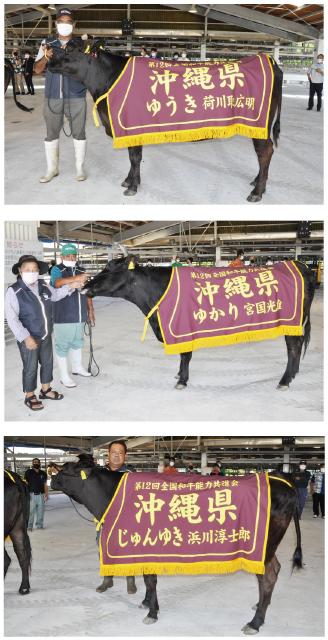 和牛の優秀性を競う全国和牛能力共進会(全共、通称「和牛オリンピック」)が10日まで鹿児島県で開かれた。県代表として出品した荷川取広明さん(宮古和牛改良組合下地支部)の「ゆうき号」、宮国光雄さん(同城辺支部)の「ゆかり号」、浜川淳士郎さん(同伊良部支部)の「じゅんゆき号」が第4区繁殖雌牛群で「一等一席」に輝いた。関係者は「優等賞にはあと一歩及ばなかったが、生産者、関係者が一丸となって取り組んでいけば結果は必ず出るという手応えをつかんだ」と喜んだ。