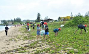 伊良部島小学校(與那覇盛彦校長)、スカイマーク、下地島エアポートマネジメントは14日、同校が設定しているサシバ環境月間(10月)に合わせ、佐和田の浜で合同ビーチクリーンを実施した。児童や社員らが浜に漂着した発砲スチロールや捨てられたペットボトルなどを拾い集めた。