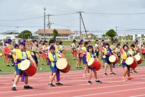 平一幼稚園、平良第一小学校(佐久本聡校長)は16日、市陸上競技場で運動会に代わる「運動フェスティバル」を開催した。幼稚園児から6年生までの630人が参加し、リレーや駆けっこで競い合ったり、踊りやエイサーなどでクラスの輪や団結心をアピールしたりした。