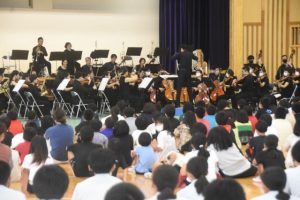 伊良部島小・中学校「結の橋学園」(與那覇盛彦校長)で19日、パシフィックフィルハーモニア東京のオーケストラコンサート鑑賞会が行われた。小学生212人、中学生108人が鑑賞し、60人規模のオーケストラが奏でる大迫力の音色を楽しんだ。