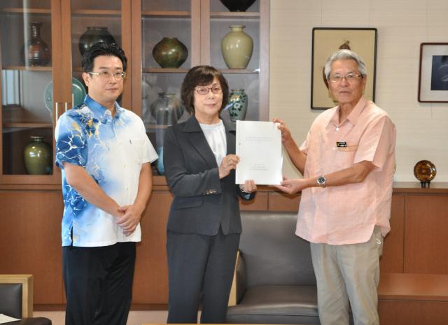 市情報公開および個人情報保護制度運営審議会の豊見山京子会長は26日、個人情報の保護に関する法律の改正に伴う市個人情報保護法施行条例の内容について座喜味一幸市長に答申した。法改正によって現行の市個人情報保護条例は廃止され、新条例が来年4月から施行される。答申を受け、市は新条例案を取りまとめ、市議会12月定例会に提案する予定。