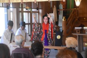 宮古神社で26日、年に1度の祭礼行事「例大祭」が行われ、渡慶次馨宮司らが神事にのっとって祝詞奏上などの儀式を執り行い、宮古の平安と住民の健康、繁栄などを祈願した。参拝した市民らは、この1年間を無事に過ごせたことに感謝し、向こう1年の五穀豊穣(ほうじょう)や無病息災、家内安全などを願った。神前では舞踊が奉納された。