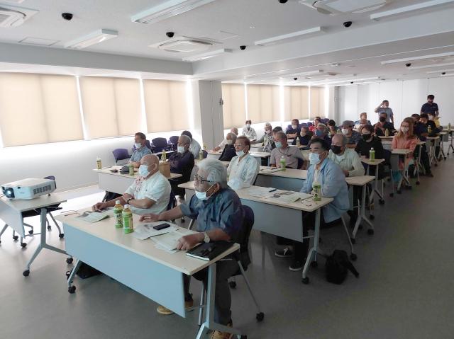 「市山羊生産流通組合」主催の研修会が26日、市役所で行われた。多数の組合員らが参加し、ヤギの適切な飼養と健康管理について、県農林水産部畜産研究センターの平良祥研究員や寺内動物病院の寺内光夫獣医師から学んだ。