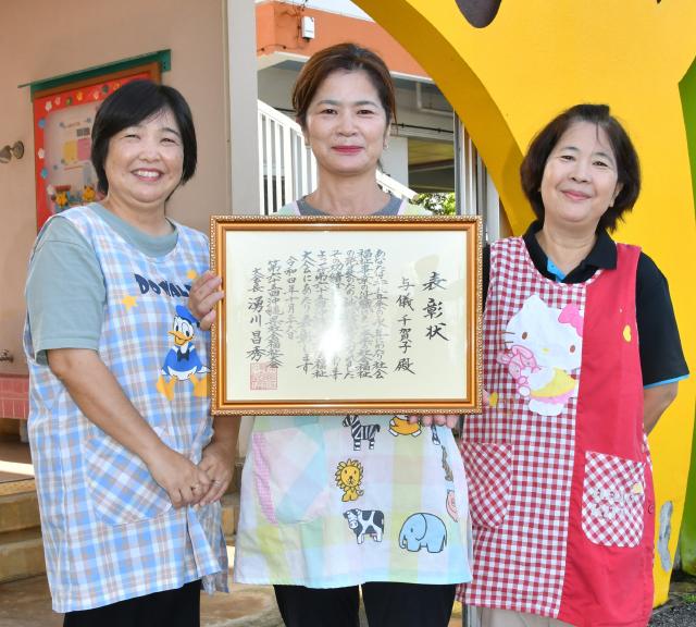 地域の人々が明るいネットワークを築き支え合う社会を目指す「第65回県社会福祉大会」が26日、宜野湾市の沖縄コンベンションセンターで開催された。大会では永年勤続功労者(25年以上勤務)として、ふたば保育園(ひらら福祉会)保育士の与儀千賀子さん、平良桂子さん、久貝ユリ子さんの3人が表彰された。このうち、大会に参加した与儀さんは「職場の仲間たちに支えられてきょうまでこれた」と喜びを語った。