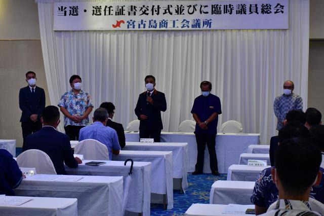 宮古島商工会議所(下地義治会頭)の議員当選・選任証書交付式および臨時議員総会が31日、市内のホテルで行われた。任期満了に伴う役員改選では、根路銘康文副会頭が新会頭に選任された。根路銘新会頭は「宮古島はまだまだ伸びしろがあるので、まちづくりを提言していきたい。1期3年間の負託を受け、宮古島の経済と地域を役職員一同で盛り上げていきたい」などと抱負を述べた。