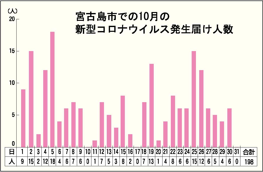 10月の1カ月間に宮古島市で新型コロナウイルスに感染したとの発生届けがあった人数は198人だった。日別に見ると最も多かった日は18人。届けが0人だった日は3日間あった。日により人数にばらつきがあり、増加、減少の傾向は見られない状態となっている。市では、年末年始に向け感染拡大の懸念があるとして、オミクロン株にも対応したワクチン(2価ワクチン)接種の検討などを呼び掛けている。