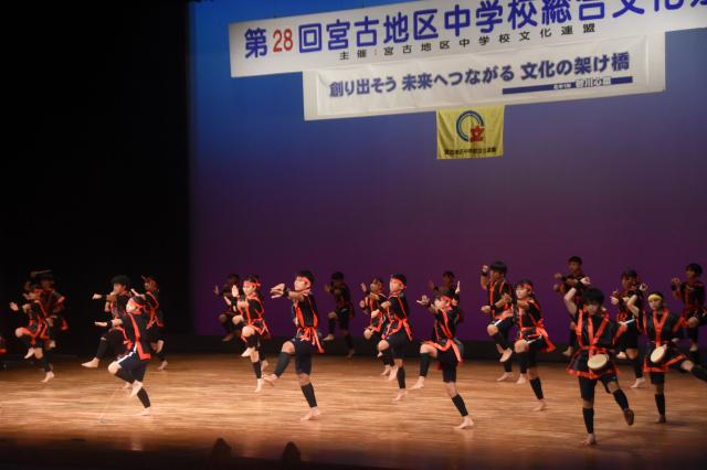 第28回宮古地区中学校総合文化祭(主催・宮古地区中学校文化連盟)の舞台発表の部が2日、マティダ市民劇場で行われた。3年ぶりの開催で、各校の生徒が伝統芸能やダンス、三線演奏、エイサーなどで多様な文化活動の成果を発表し、演目の中で宮古文化を未来につないでいく決意を表現した。
