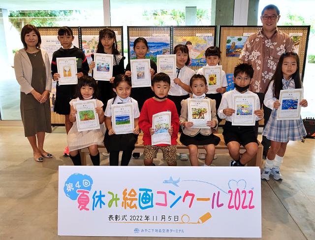 下地島エアポートマネジメント(SAMCO、伴野賢太郎社長)主催の第4回夏休み絵画コンクール2022の表彰式が5日、みやこ下地島空港ターミナルで開かれ、金賞、銀賞、審査員賞などの受賞者計11人に賞状と副賞が贈られた。金賞には北小学校1年の石貝風麻君の「さらはま漁港」が選ばれた。