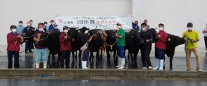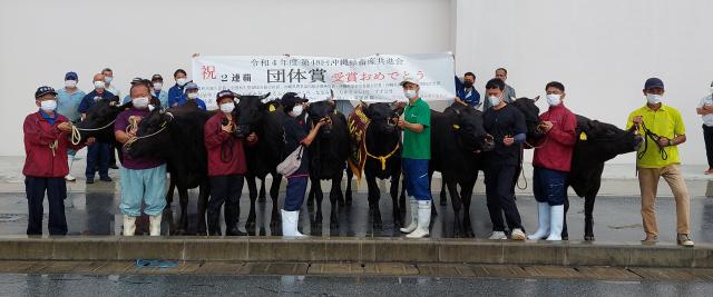 第48回県畜産共進会で初の団体賞2連覇を果たした宮古島市の代表牛が10日、凱旋(がいせん)帰島した。平良港では雨の中、畜産関係者が横断幕を掲げて出迎え、快挙をたたえた。共進会では肉用牛の部「高等登録群」で、砂川健治さん(66)=市下地入江=所有の「母・はるな」号と「娘・のぞみ」号が優秀1席となり、農林水産大臣賞に輝いたほか、上地美優桜(ちゅら)さん(18)=市平良久貝=が優秀2席を獲得した。