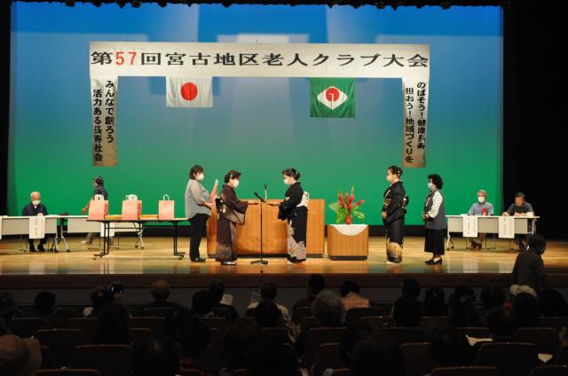 「伸ばそう!健康寿命、担おう!地域づくりを」をスローガンにした第57回宮古地区老人クラブ大会(主催・宮古地区老人クラブ連合会)が11日、マティダ市民劇場で行われた。老人クラブ役員として活動の振興に寄与した12人を育成功労者として、また上区老人クラブなど3団体を優良老人クラブとして表彰した。魅力ある活動の展開などを盛り込んだ大会宣言を全会一致で採択した。芸能発表や作品展も盛況だった。