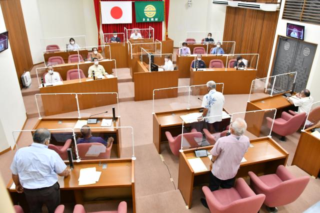 質疑で豊見山正氏が「これまで村はこれ以上の追加費用は一切発生していないと説明していたが、さらに8000万円も支払う。なぜか」と質問。伊良皆村長は「裁判所が2年以上の審理経過を踏まえ、公平な立場で双方に勧告したもので、内容は公平かつ合理的なものと判断できる」と答えた。また「損害賠償額は1億8000万円になる。村民税の2年分。今年度の村予算の5%となる。村の責任もある。伊良皆村長は進退も含めて責任を明言すべき」と追求した。