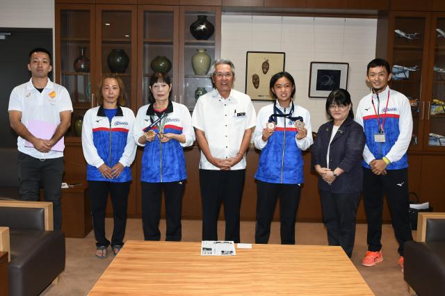 座喜味市長(中央)にメダル獲得を報告した伊良波さん(左から3人目)、丸山さん(右から3人目)と関係者=16日、市役所