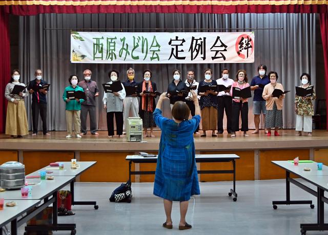 20日にマティダ市民劇場で開催される「美ら島おきなわ文化祭2022」の市独自事業「宮古の宝再発見みゃーくふつフェスタ」で、宮古島市歌~黎明(れいめい)の空に~」を西原の方言版で初めて披露する西原コーラス「ゆりの会」(仲間忠会長)のメンバーは15日、西原公民館で最後の練習を行った。メンバーたちは本番で、市歌の歌詞と島言葉の魅力を同時に発信しようと、真剣な表情で練習に取り組んだ。