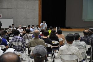 下地島空港周辺用地の利活用に係る説明会(主催・県、宮古島市)が16日、伊良部公民館で行われた。県は今後の利活用事業を推進していくため、現在無償で耕作を行っている県有地の明け渡しを求めたのに対し、耕作者らは「われわれの生活はどうなる」と反発。双方の主張は平行線をたどった。県が求める明け渡しの期限は2024年3月末。