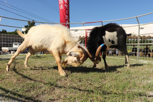 【多良間】第22回多良間島ピンダアース大会(主催・同実行委員会)が19日、村多目的広場で行われた。3階級に計16頭のヤギが出場し、角と角を激しくぶつけ合うなど熱戦を繰り広げた。重量級は前回大会覇者の「大空(たから)1号」が連覇を達成した。