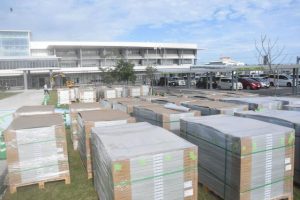 市役所庁舎内で使用される電気を発電する太陽光発電パネルを庁舎駐車場に設置、整備工事は、22日までに太陽光発電パネル約1000枚が市役所に届き、駐車場内に整備された屋根上の架台に太陽光発電パネルを設置する作業の準備が着々と進められている。
