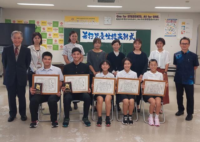 2022年度善行児童生徒表彰式が24日、県宮古教育事務所であり、宮古地区退職校長寿会の上里雅章会長が平良夢輝斗さん(城東中3年)ら5人に賞状を手渡した。毎年、学習や生活面で他の模範となるような活動をしている児童生徒を表彰している。
