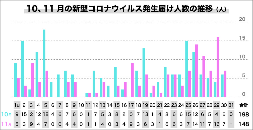 10月で10人を超えた日は6日間で、1日での最多人数は18人だったことから、前月比ではいずれも下回っているものの、11月は月末の26、27、29日に2桁台が集中したことから、12月もその傾向が続くことにならないかが心配される。