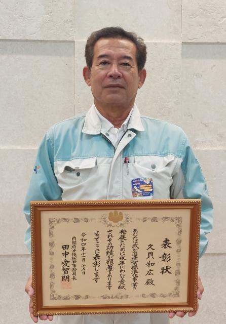 2022年度産業標準化事業功労者の沖縄総合事務局長表彰を大米建設宮古本店砕石部長の久貝和広さん(61)が受けた。久貝さんは1986年入社以来、36年間、製造出荷する生コンクリートの品質向上、社業の発展に寄与した。