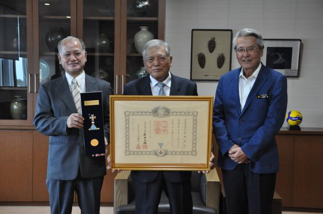秋の叙勲で瑞宝双光章(行政相談功労)を受章した真壁恵修さん(市上野上野)が1日、市役所に座喜味一幸市長を訪ね、受章を報告するとともに「自分一人ではなく、みんなでもらった章だと思う」と感謝の言葉を述べた。