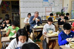 市議会の野党・中立系会派の市議5人が2日、久松小学校(友利直喜校長)を訪ね、視察を兼ねた給食交流会を行った。児童たちと給食を食べた後、給食についての要望を聞き取った。児童たちは「デザートがある日を増やしてほしい」などと求めた。