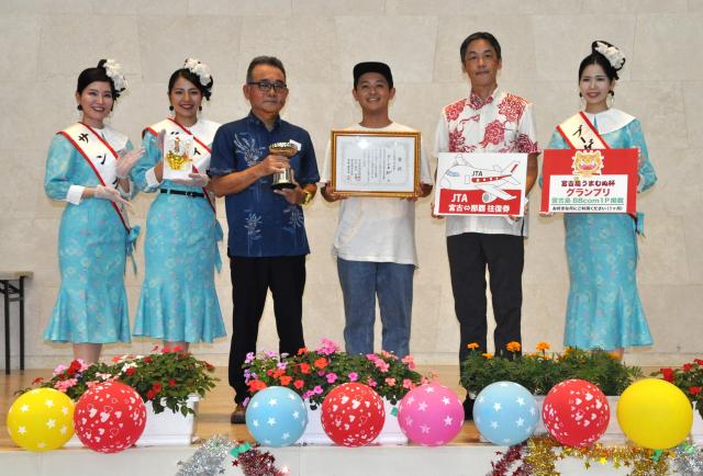 優勝したのは漢那仁君(伊良部島小6年)、諒君(同4年)の兄弟で、ねじり鉢巻き姿の兄仁君は鳥羽一郎の「鯱(しゃち)」を熱唱、弟諒君は大漁旗を振り、発泡スチロールで作ったという漁船から一本釣りでカツオを2匹、3匹と釣り上げる圧巻のパフォーマンスを披露し、会場から大きな拍手を受けた。