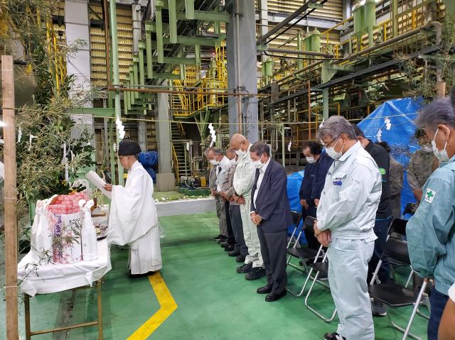 【多良間】多良間製糖工場で6日、ボイラー火入れ式と安全祈願祭が行われた。宮古製糖(渡久山和男社長)の関係者をはじめ、運天宏和副村長、村の職員らが参加し、2022ー23年期産のサトウキビ製糖操業の安全を祈願した。