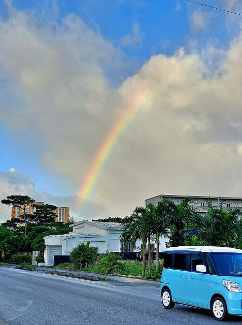 12月に入ってからも、ぐずついた天気が続く宮古島地方。慌ただしい師走の長雨にうんざりする中、10日の朝には雲の隙間から差し込む日差しを受けて虹が現れた。