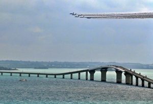 航空自衛隊のアクロバット飛行チーム「ブルーインパルス」が11日、宮古島上空で展示飛行を披露した。観覧会場となった平良港トゥリバー地区の緑地公園には大勢の見物客が詰め掛け、白煙を噴射しながら飛行する6機編隊に大きな歓声を上げた。飛行は航空自衛隊宮古島分屯基地開庁50周年記念のイベントで、ブルーインパルスが宮古島で飛行するのは初めて。