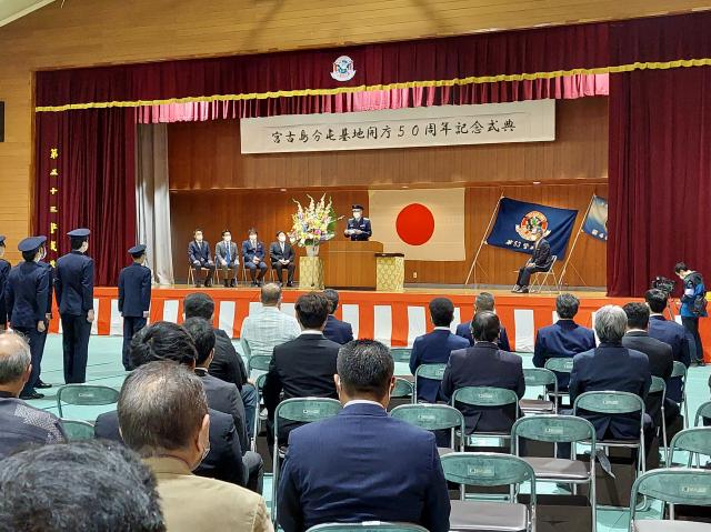 航空自衛隊宮古島分屯基地の開庁50周年記念式典が11日、分屯基地内の体育館で開かれ、隊員や関係者が出席した。髙木寿宗司令は「訓練を怠ることなく任務を遂行し、国民の負託に応える。今後も地域に信頼される分屯基地を目指す」と式辞を述べた。
