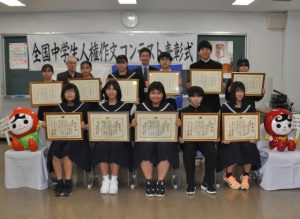 第41回全国中学生人権作文コンテスト県大会の宮古地区表彰式が14日、平良地方合同庁舎であり、入賞した西辺中3年の上原美春さんら5人に那覇地方法務局宮古島支局の石垣優支局長が表彰状を手渡した。最優秀賞を受賞した上原さんは「決断」、下地中3年の上地志穂さんは「笑顔のために」との題で、いじめと偏見についてそれぞれ思いをつづった。下地中3年の西田結萌さん、久松中1年の兼島楓さんは優秀賞、西辺中1年の砂川うたさんは奨励賞だった。上原さんの作品は法務省で開かれる中央大会に県代表として推薦された。