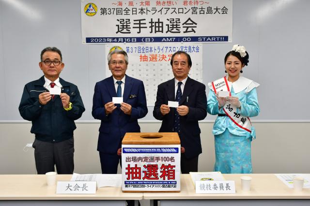 第37回全日本トライアスロン宮古島大会の出場者を決定する抽選会が16日、市役所で行われ、座喜味一幸大会長らが抽選で100人を選出した。事前選抜された1100人と合わせて、出場全1200人が決定。選手への通知は25日午後2時にメールで行われる。同大会は来年4月16日に4年ぶりに開催される。