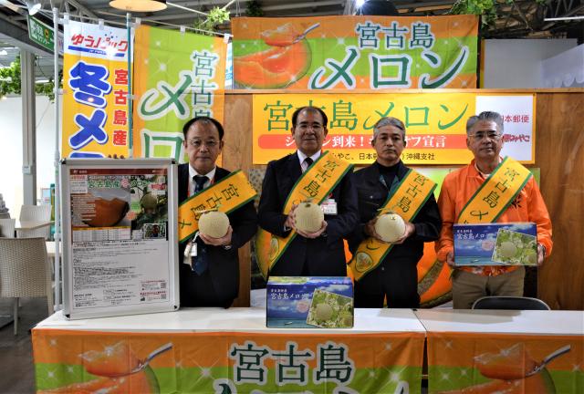宮古島産メロンが店頭に並び始めた。冬場出荷のメロンは注目を集めており、市場の評価は高い。島の駅みやこ、日本郵便沖縄支社は17日、「宮古島メロンシーズン到来!キックオフ宣言」を同店で開催した。メロンの出荷時期は1期冬メロンが12~2月、2期春メロンが4、5月中旬ごろ。