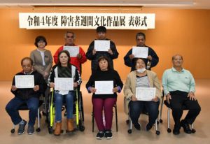 2022年度障害者週間「文化作品展」の表彰式が22日、市役所大ホールで開催された。5部門の各入賞者計11の団体、個人に座喜味一幸市長に代わり、仲宗根美佐子福祉部長から表彰状が手渡された。