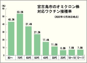 市新型コロナウイルスワクチン接種対策室では「年末年始は人の移動が多くなり、島外から宮古島を訪れる人も増える。ワクチンを接種することで感染時に重症化を防ぐことができるとされているのでオミクロン株対応ワクチンの接種がまだの人は年内の接種を検討してほしい」と呼び掛けている。