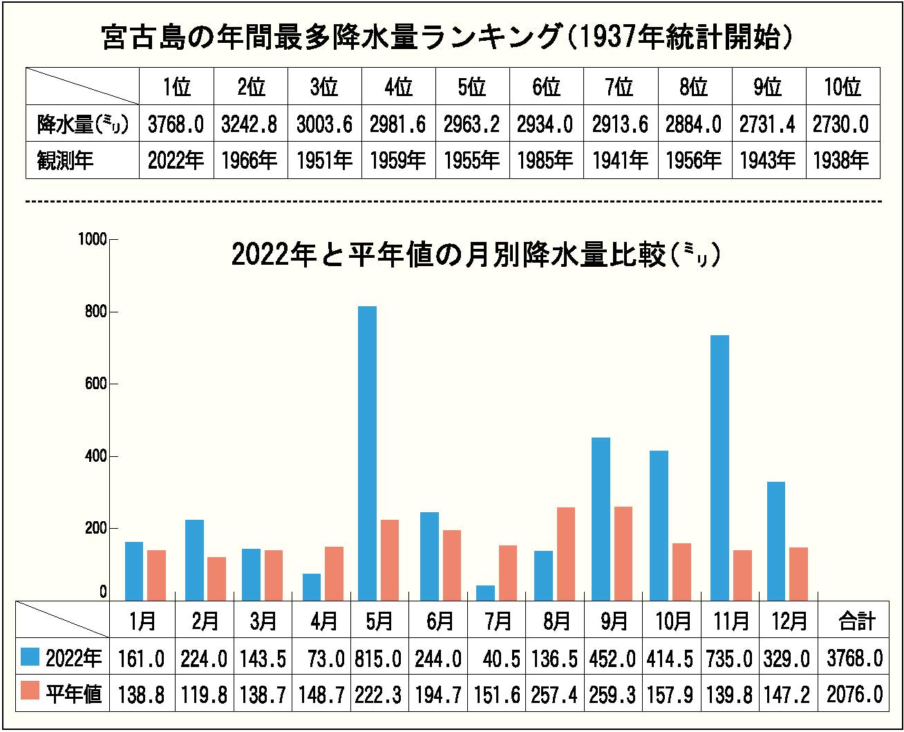 1937年の統計開始以降、宮古島で観測された年間最多降水量ランキングを見ると、2022年を含め3000ミリを超えたのは3回のみ。これまでの最多記録は1966年の3242・8ミリだったことから、2022年はその降水量を525・2ミリ上回り、最多記録となった。2022年、1966年に次ぐ3位となるのは1951年の3003・6ミリ。
