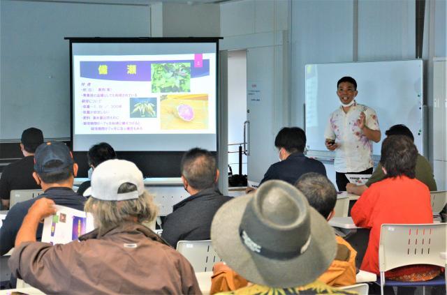 製菓会社の御菓子御殿(本社読谷村、澤岻英樹社長)による「紅いも植え付け説明会」が11日、JTAドーム宮古島会議室で開かれた。同社の城間一朗さんが紅イモの品種や栽培方法、買い取り価格などについて紹介した。説明会には多くの市民が参加し、宮古島での紅イモ栽培について興味深く話を聞いていた。