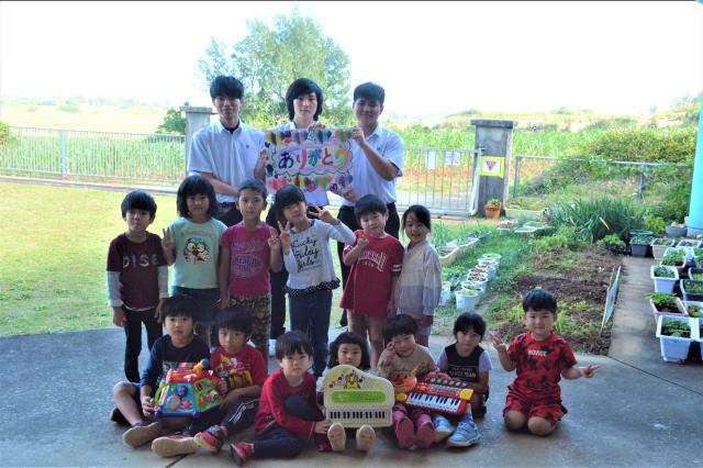 宮古工業高校(知念俊一郎校長)は同校で行っている「地域の工場を担う事業」で、西城保育所(根間敬子所長)の壊れたおもちゃを修理して返却した。同校電気情報科の生徒3人が12日、同保育所を訪れ園児たちにおもちゃを手渡した。