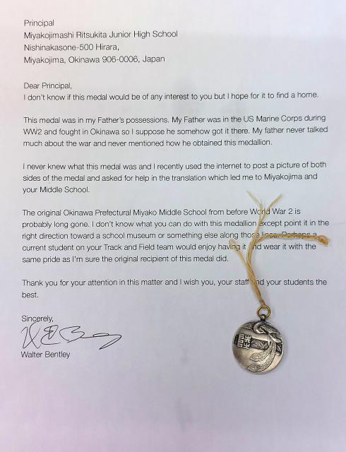 ベントレーさんによると、父からは戦争のことも、メダルのことも全く聞いていなかったが、インターネットでいろいろ調べたところ、宮古島の北中学校の情報を得て、手紙と一緒に送ったとしている。