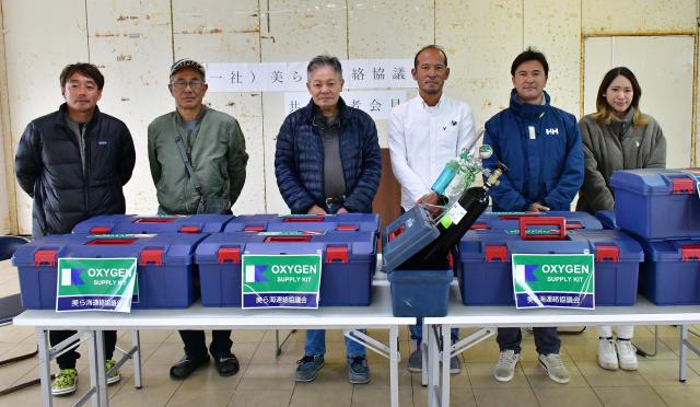 海難死亡事故ゼロを目指して、宮古島美(ちゅ)ら海連絡協議会(渡真利将博代表理事)が、緊急用の「酸素供給キット」を購入し、会員事業所に配備する計画を進めている。関係団体および行政からの助成を求めながら、配備率100%の早期達成を図る。渡真利代表理事らが25日、宮古島漁業協同組合で会見を開き、「安全対策を強化し、万が一に備えた。死亡事故がない体制を整えたい」と語った。