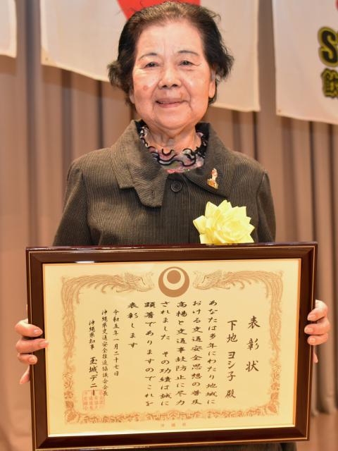 【那覇支社】県は27日、那覇市の県総合福祉センター「ゆいホール」で2022年度県交通安全功労者等表彰式を行い、交通事故防止に顕著な功績が認められた下地ヨシ子さん(81)=平良西里=を含む16の個人・団体に対して交通安全功労者などとして表彰状を贈呈した。表彰式で下地さんは、池田竹州副知事から表彰状と記念品を受け取った。